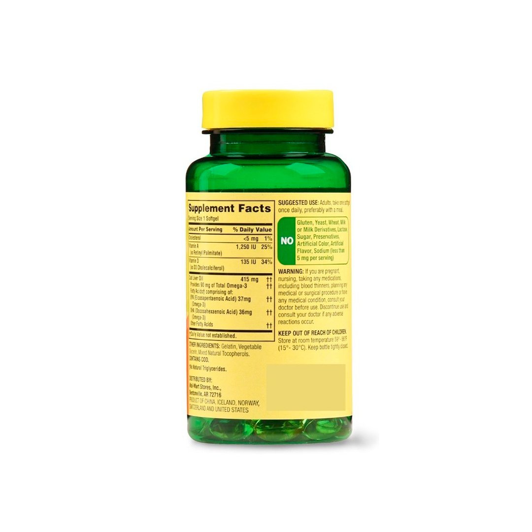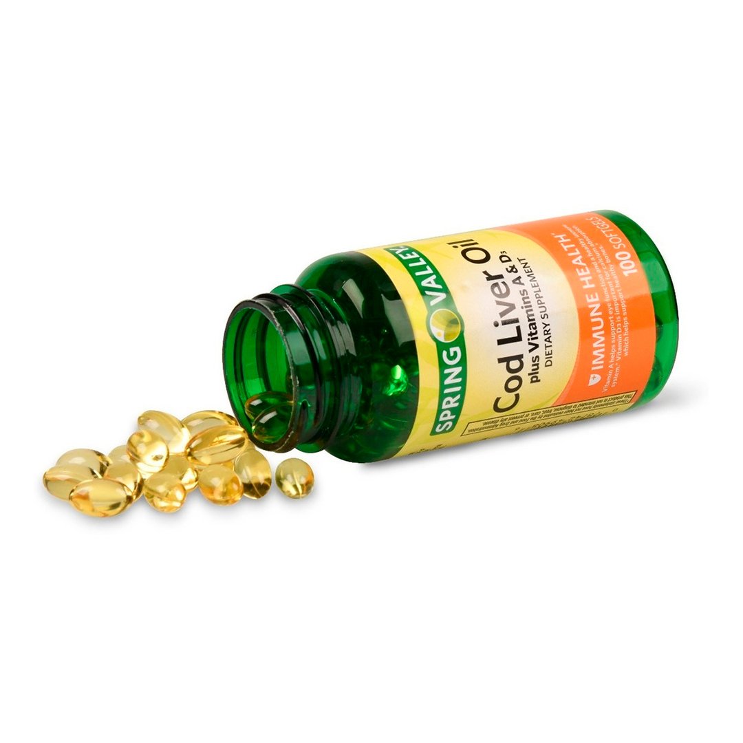 Las cápsulas blandas de aceite de hígado de bacalao Spring Valley le brindan vitaminas A y D3 para apoyar la salud del sistema inmunológico. * La vitamina A contribuye a la salud de los ojos y un sistema inmunológico fuerte, y la vitamina D3 ayuda a mantener huesos fuertes y saludables. * Estas cápsulas blandas también proporcionan omega-3 ácidos grasos, que contribuyen al bienestar general. * Hay 415 miligramos de aceite de hígado de bacalao y tiene 1250 UI de vitamina A y 135 UI de vitamina D3. Tome una cápsula blanda al día, preferiblemente con una comida. No contiene gluten, levadura, trigo, leche o derivados lácteos, lactosa, azúcar, conservantes, colorantes y aromatizantes artificiales y sodio. Lleve a casa el aceite de hígado de bacalao Spring Valley más vitamina A y D.