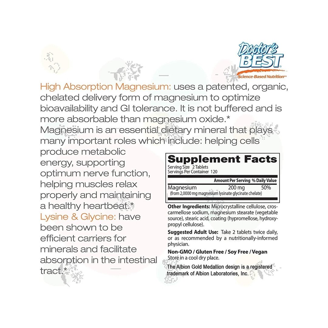 Doctors Best alta absorción de magnesio, ayuda a la densidad ósea, ayuda a mantener un latido normal y regular regular y ayuda a la salud general cardiovascular
